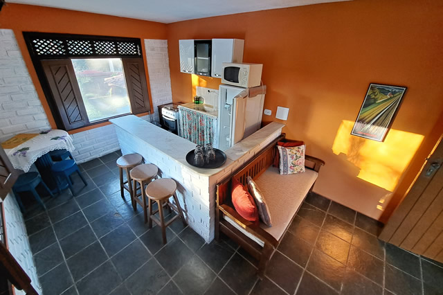 Piso Térreo, Studio com sala (TV), cozinha e quarto integrados com banheiro privativo. Estacionamento para 2 veículos.